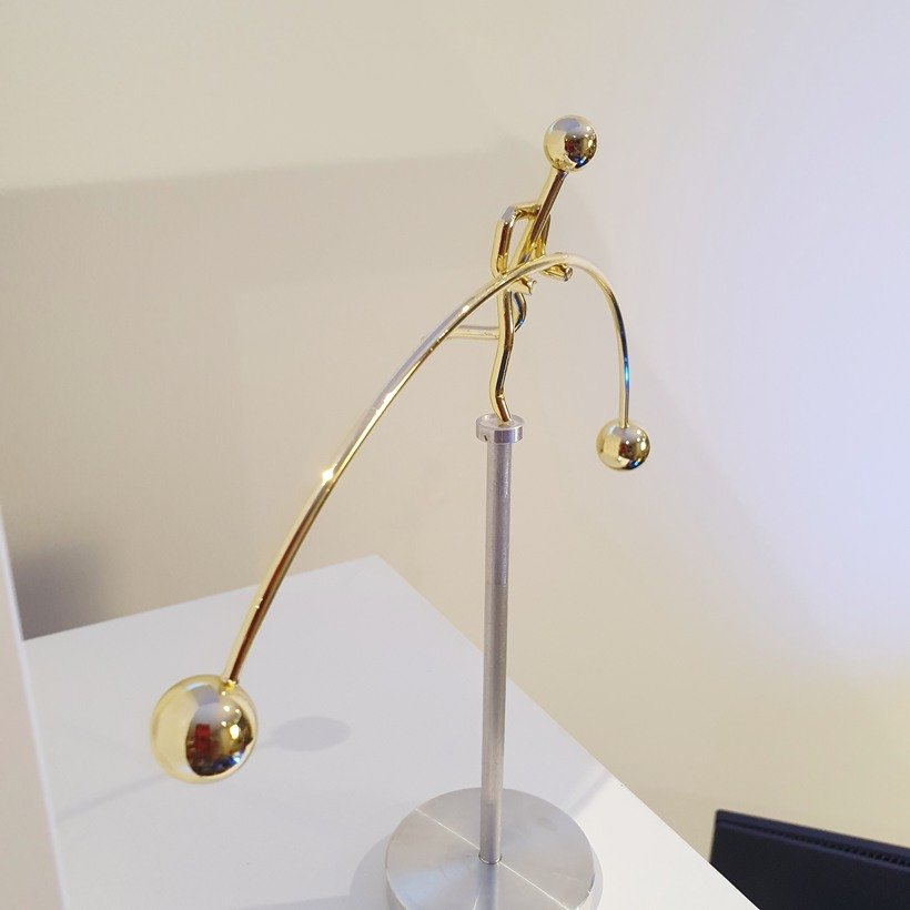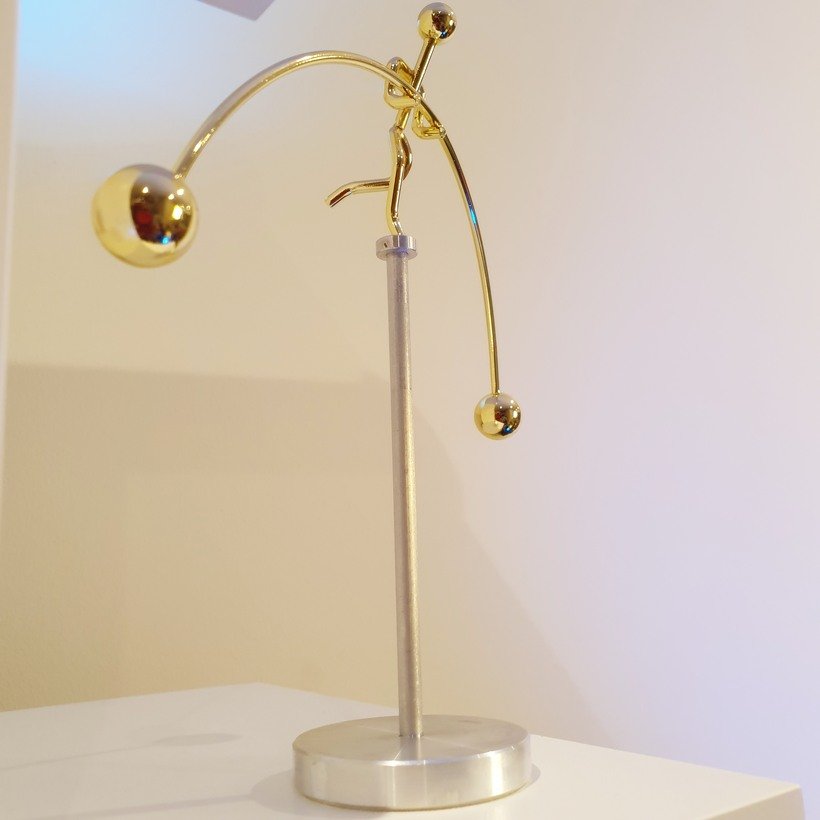 A striking kinetic sculpture of a slender, gold-finished weightlifter poised in perfect one-legged balance, effortlessly carrying heavy barbell weights on a thin pole. With no permanent attachment, a gentle push sends the figure swaying, yet it always returns, slowly and surely, to flawless equilibrium, showcasing quiet, unbreakable resilience.
